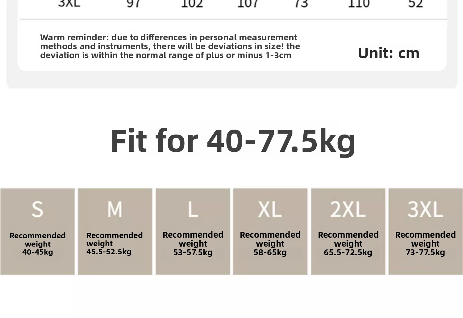 Sizes: S to 3XL (40-75 kg weight range)